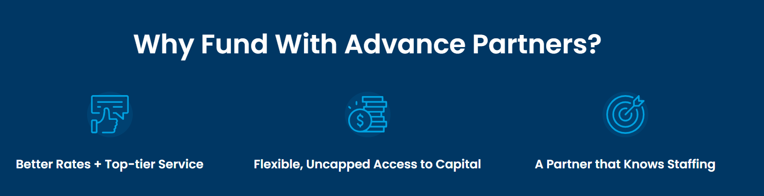 Advance Partners champions next-level staffing firm growth through payroll funding, back office solutions, and strategic business development coaching. Headquartered in Cleveland, OH, they are 100% dedicated to the talent acquisition industry and are proud to support businesses that put millions of people to work every day.
